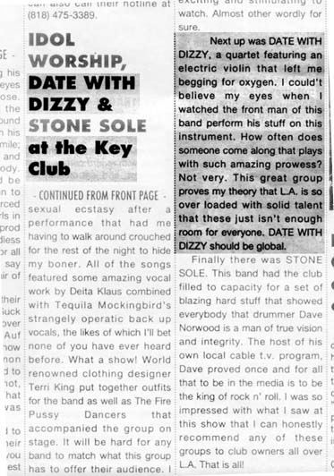Doing what he loved best. Floor 13 at the Gaslight. I wrote this song called Runaway for Denis when his father passed away. It seems to speak to him now. -Zuma Denis was a very influential person. Here is what Greg Kupka, son of our revered music proffesor Craig Kupka, expressed: The Seed It was a cold night in the fall of 1990 when Denis changed my life. Denis Boder, a student of my dad's at the Los Angeles County High School for the Arts, played a cherry red Zeta electric violin in a combo rooted heavily in Fusion-Jazz music. I attended the concert, LACHSA's annual fall jazz showcase, with my mom, having no idea what I was in for. I sat, mesmerized, as Denis ripped the hairs out of his bow sawing that red violin and making music in way that I'd never thought possible from a violin -- from that moment forward, I knew what I wanted to spend the rest of my life doing. ------- Here is a clipping from a Rock City News article.